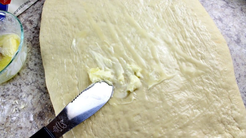 - Roll the dough out to the shape of a large 8 x 16 rectangle and spread 4 tablespoons of softened butter all over the dough.