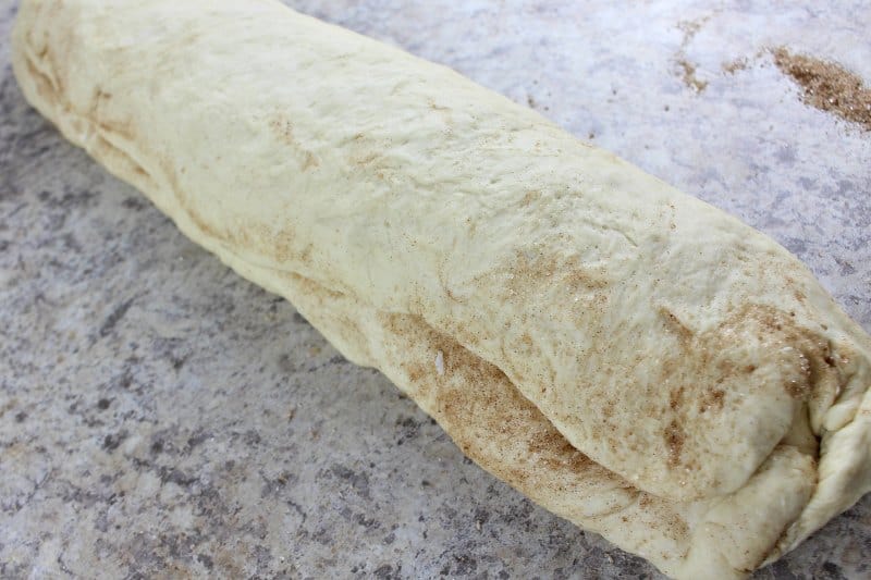 - Starting with the long side of the dough, roll into a log and pinch the ends to seal tightly.