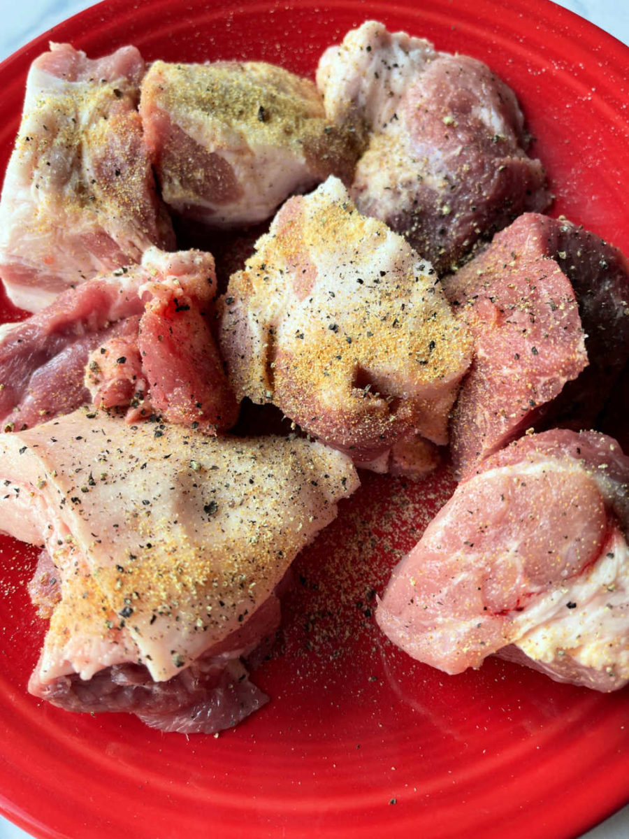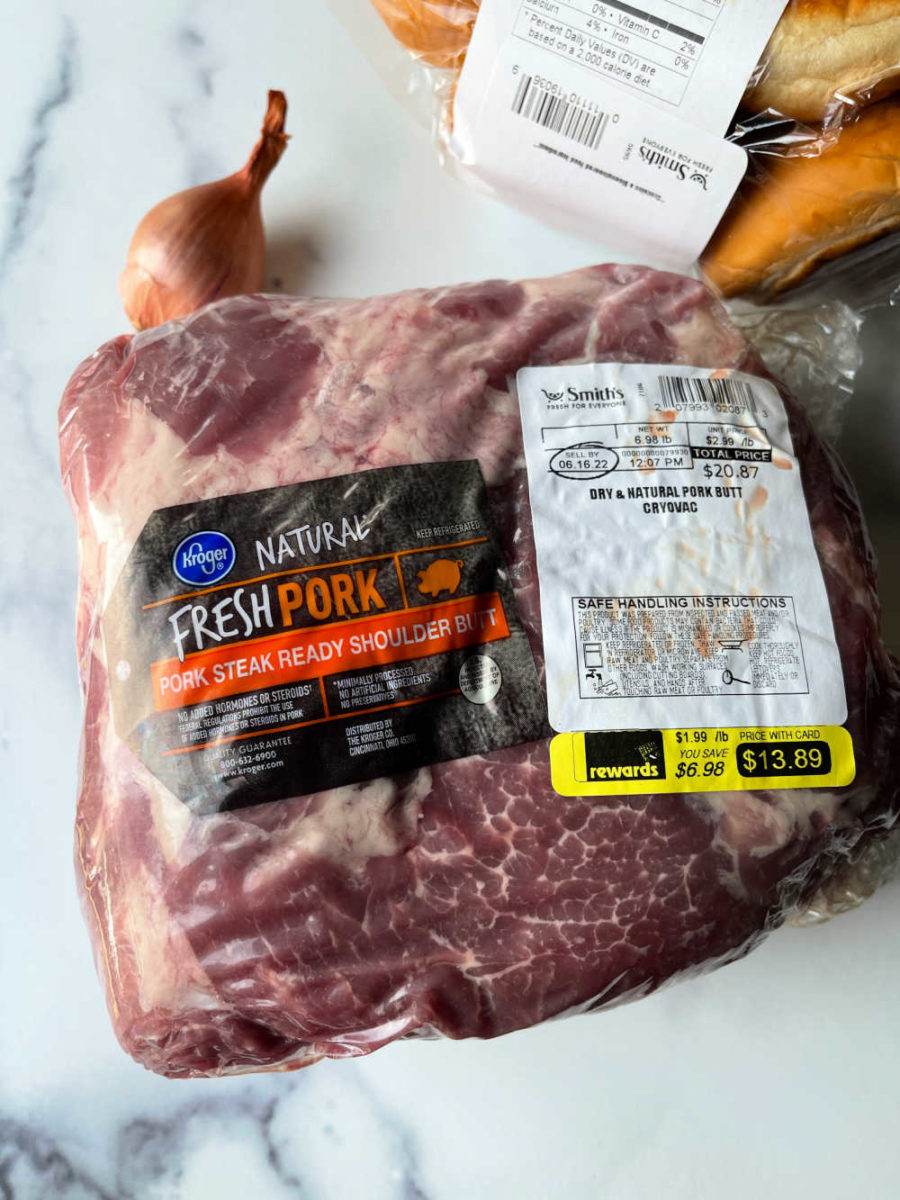 You can use either a pork shoulder roast or a pork butt roast. Often, the butt roast is on sale and cheaper than a shoulder roast. Both cuts of pork are part of the shoulder. The butt roast just has a bone and some more fat on it. Chop the pork shoulder roast into large pieces. You can trim some fat off but don’t trim it all as it provides a ton of flavor.