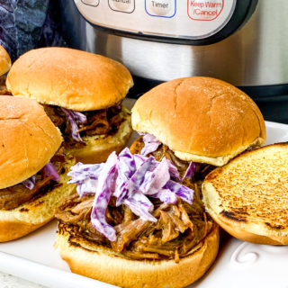 Pulled pork sliders made in an Instant Pot using pork shoulder are served on slider buns topped with a homemade cabbage slaw.