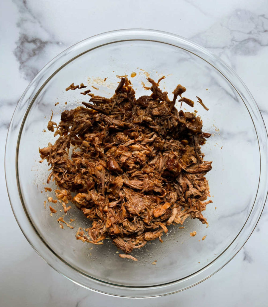 - Transfer the shredded pork with tongs to a large bowl and toss with the remaining barbecue sauce.