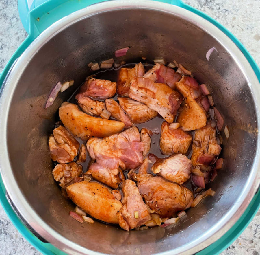 - Pour in the apple cider vinegar and 3/4 cups of barbecue sauce. Return the seared pork and its juices to the unit and cover, locking the lid into place.