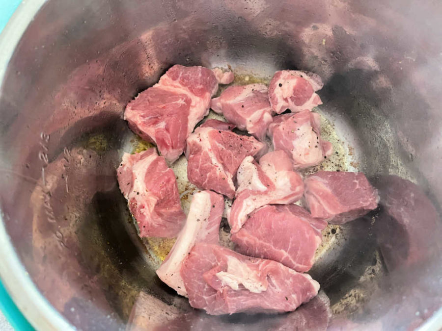 Season 1/2 the chopped pork shoulder with 1/2 teaspoon garlic powder, plus salt and black pepper, to taste. Add the pork to the Instant Pot. Sear until pork is browned on all sides, approximately 1-2 minutes per side. Transfer to a large, rimmed plate. Set aside.
