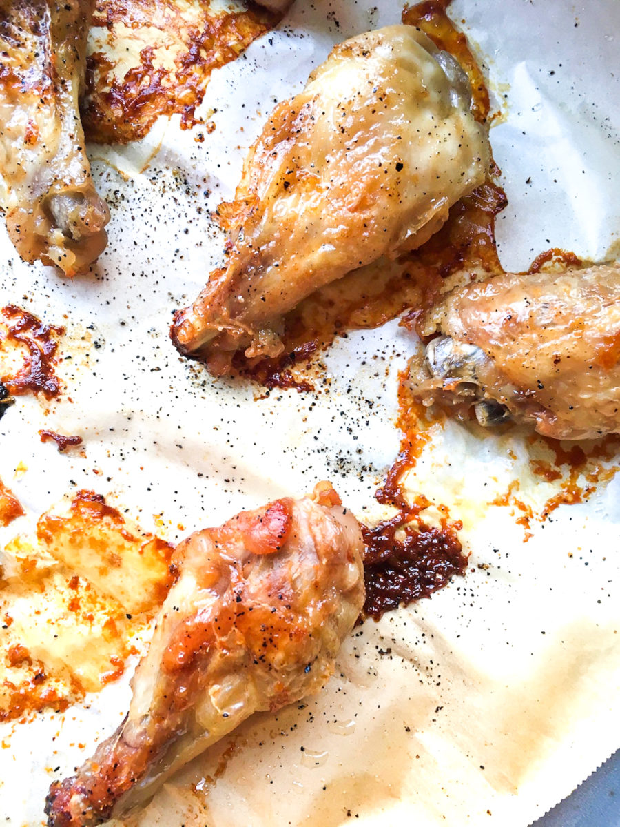 Add the chicken wings to the baking sheet in a single layer, not touching or overcrowding. Season wings with salt and black pepper, to taste, before placing them in the preheated oven. These are also sprinkled with a little bit of paprika. Bake until skin is crispy, approximately 45-50 minutes.