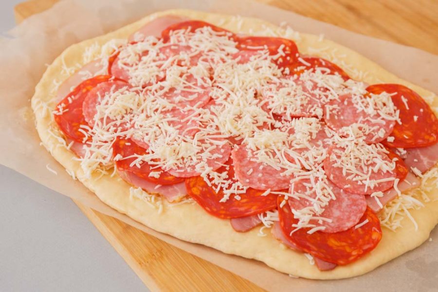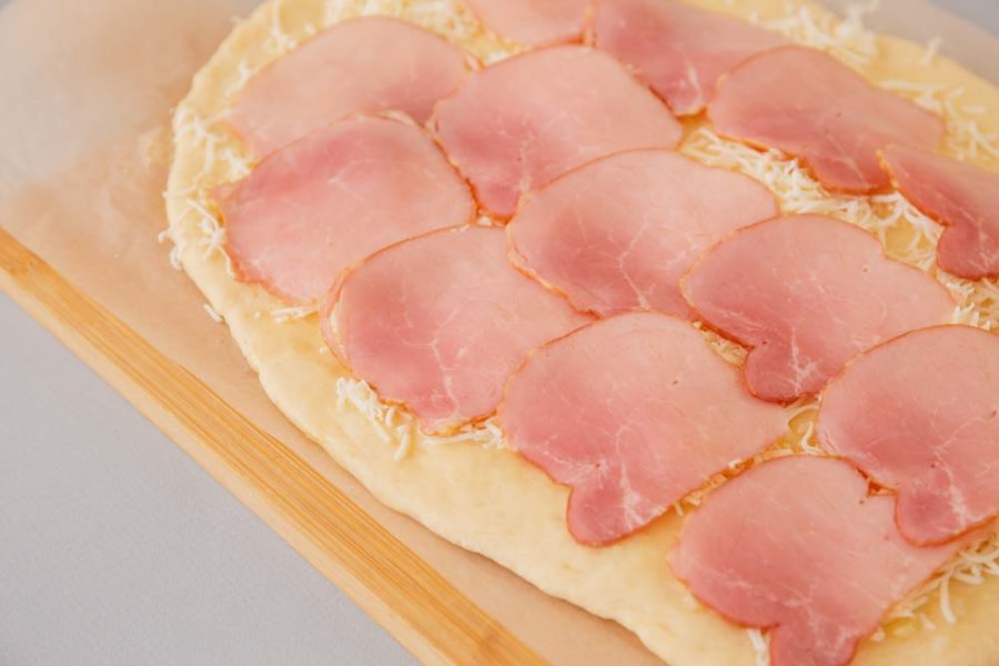 - Sprinkle the dough rectangle liberally with half the grated mozzarella. Evenly spread the ham slices on top of the cheese.