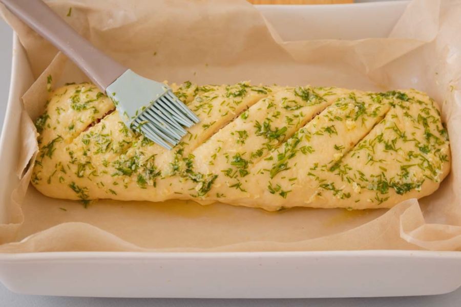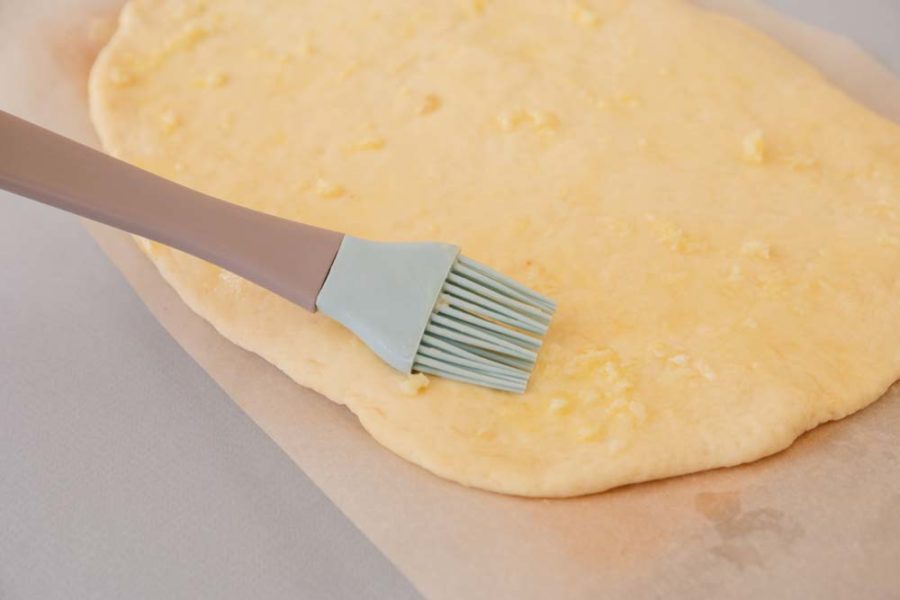 Roll out the dough into a rectangle on the mat or parchment paper. Mix together half the butter and the crushed garlic. Brush the dough with half the melted butter mixed with the crushed garlic.