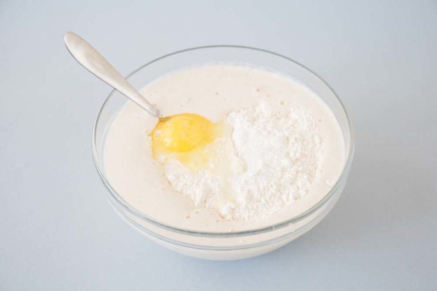 After 10 minutes, add the egg, salt, remaining flour, and melted butter.