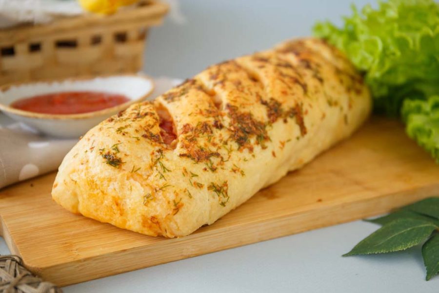 Once the stromboli has finished baking, slice and serve with a side of homemade pizza sauce or marinara sauce.