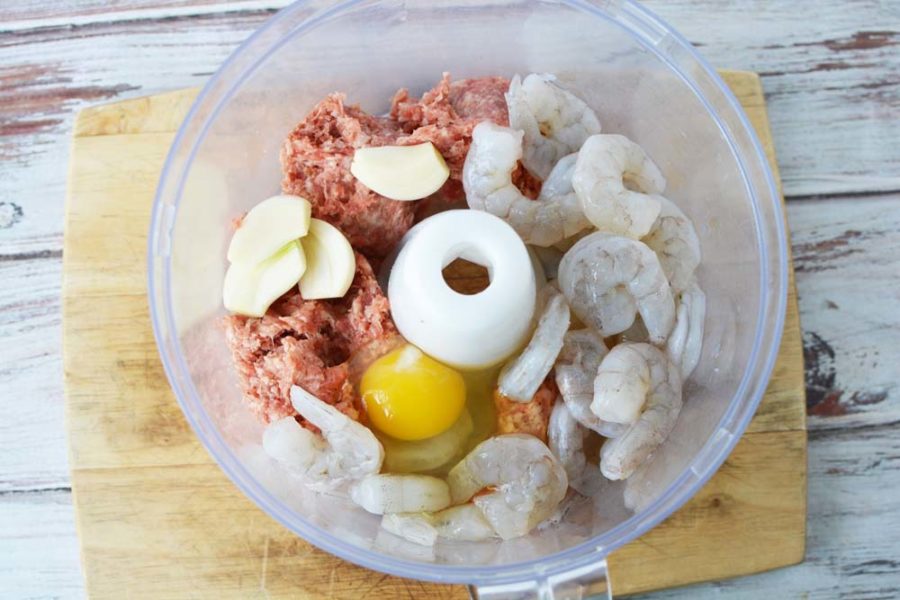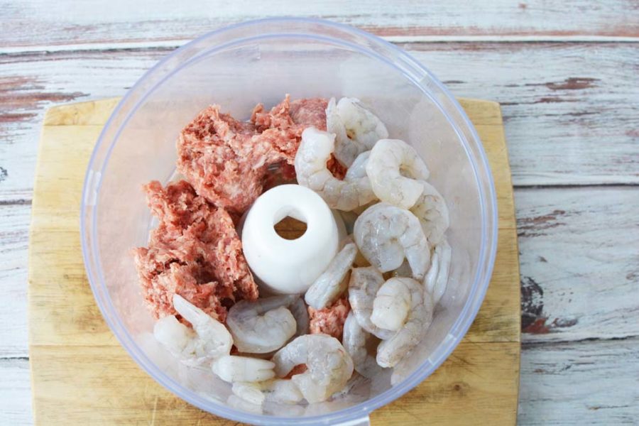 Thaw shrimp, if frozen. Once thawed, peel and devein shrimp. You can purchase shrimp that is already peeled and deveined to make this process quicker. Put the shrimp and ground pork in a food processor.