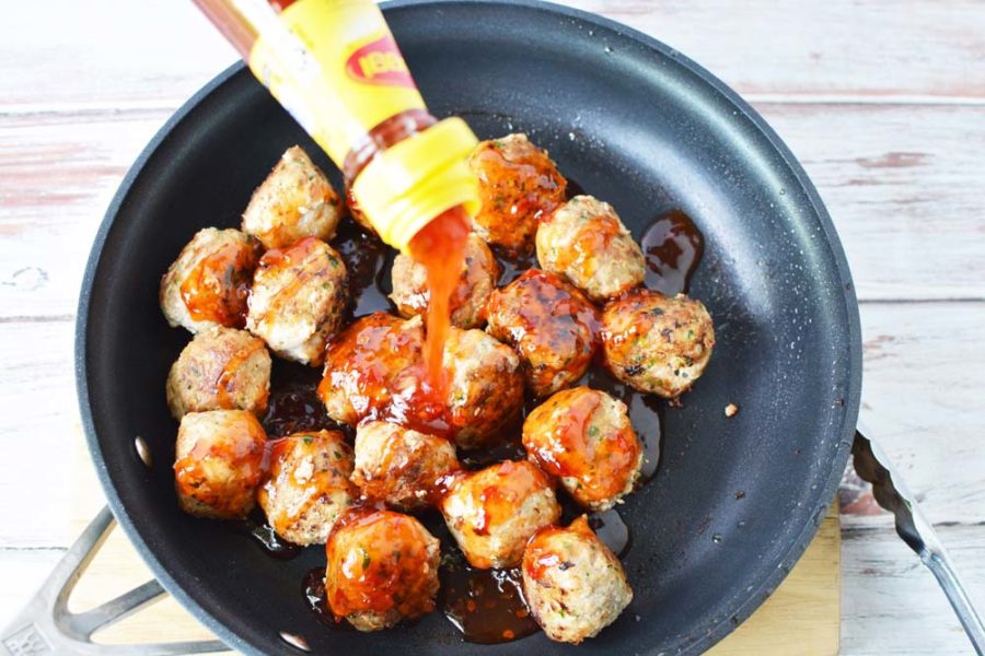 Once you have finished cooking all the meatballs, return them all to the pan. Toss the meatballs with the Thai sweet chili sauce until well coated and heated through. We used almost the entire bottle of sauce but you can use as much or little as you prefer.