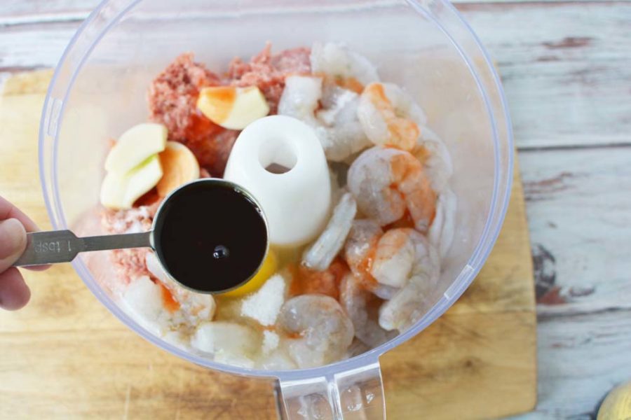 - Put the shrimp, pork, garlic, egg, sugar, sambal oelek, fish sauce, lime juice, and salt in a food processor. Pulse until smooth and well combined.