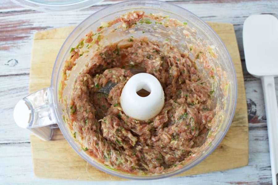 Add the garlic, egg, and sugar to the food processor with the meat.