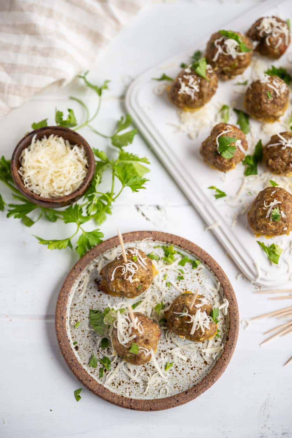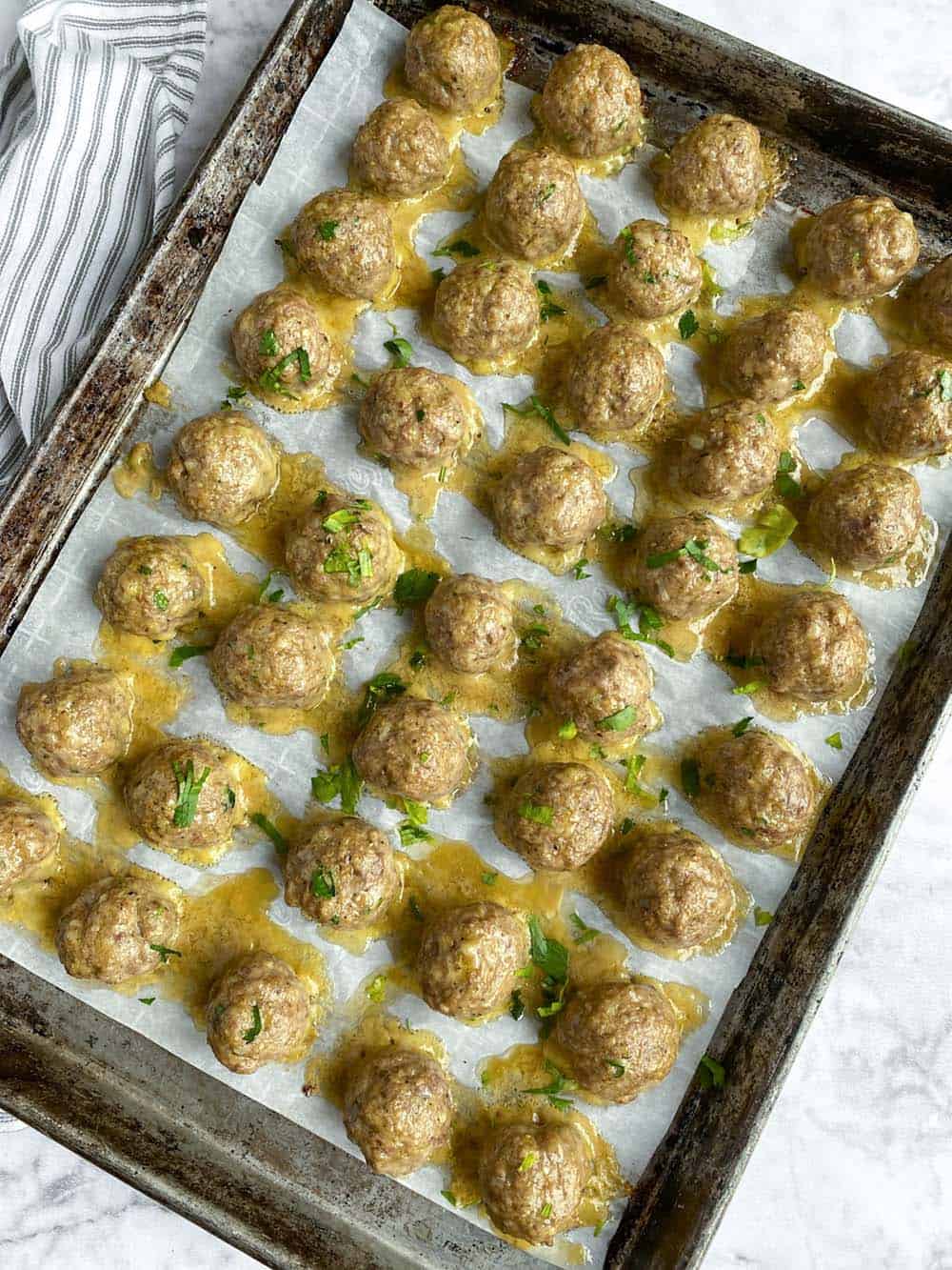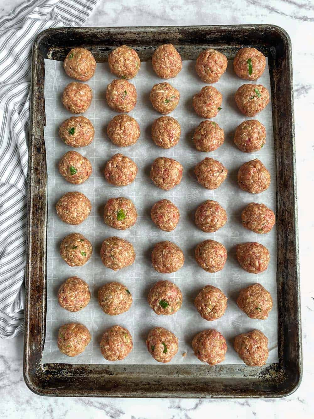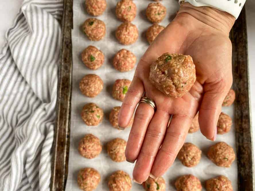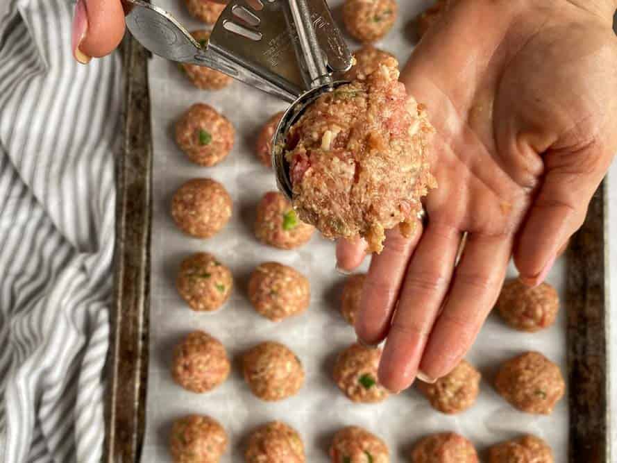 - Using a 1 tablespoon size cookie scoop, scoop the meat mixture, one scoop at a time, into your hands, roll into the shape of a ball, place on the baking sheet.