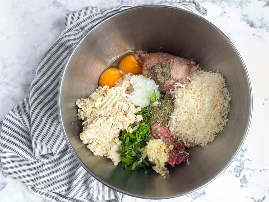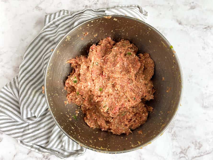 - Combine all ingredients into a large mixing bowl. Gently mix with your hands until blended well. Your hands are your best tool here.