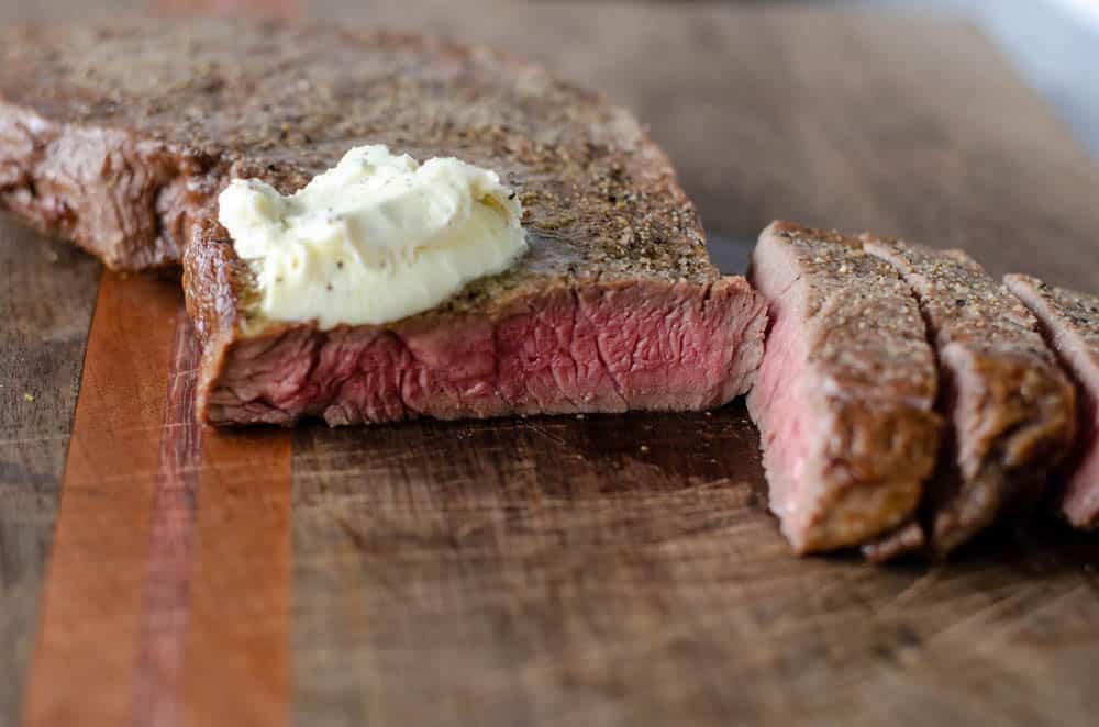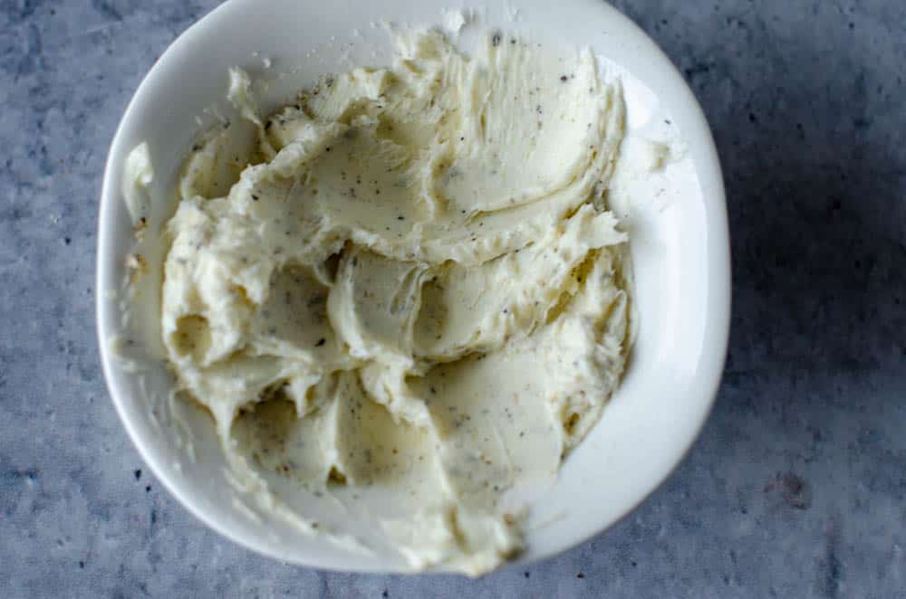 Now for the best part of these steaks – the seasoned butter! While your steaks are cooking, mix together the remaining spices (salt, garlic, and pepper) with the butter in a small bowl. Set aside. You can also prepare this butter ahead of time.