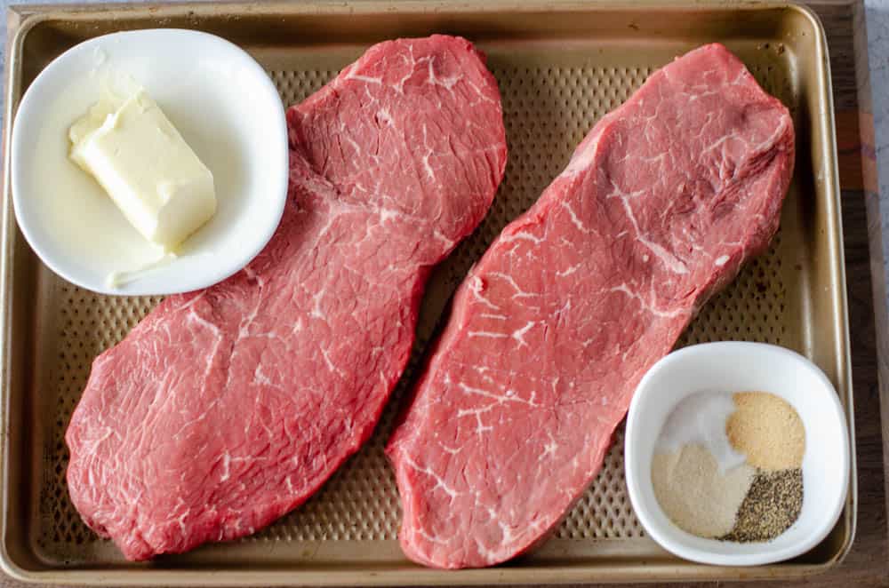 - You can use any steaks you prefer. These steaks are ribeyes that were about 1 pound total between the two steaks. If you use thinner steaks, adjust the cooking time down a bit.