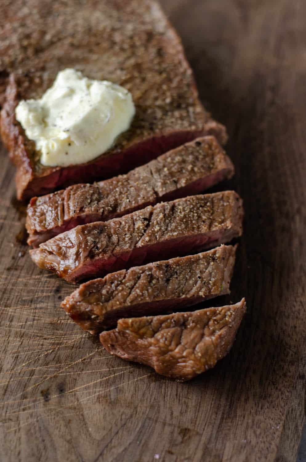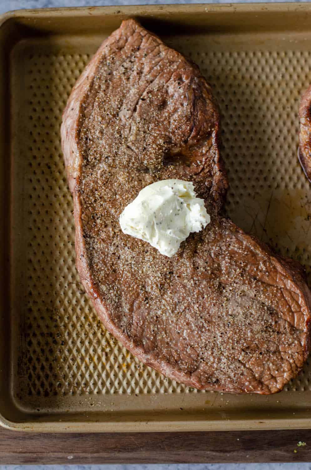 Once the steaks are done, place them on a tray or serving platter. Put a pat of butter on top of each steak.