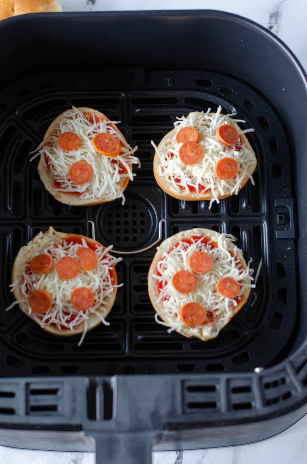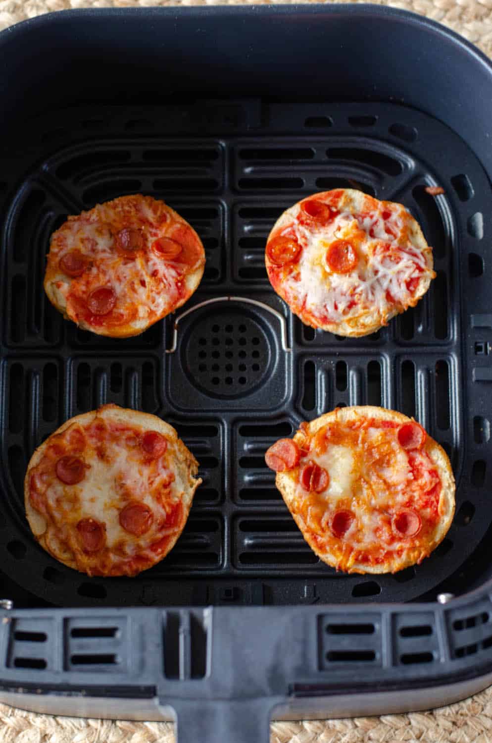 Place 4 mini bagel halves into the air fryer basket. Set the timer to 2 minutes and allow to cook. Your cheese should be melted and the bagels heated through after the timer is done.