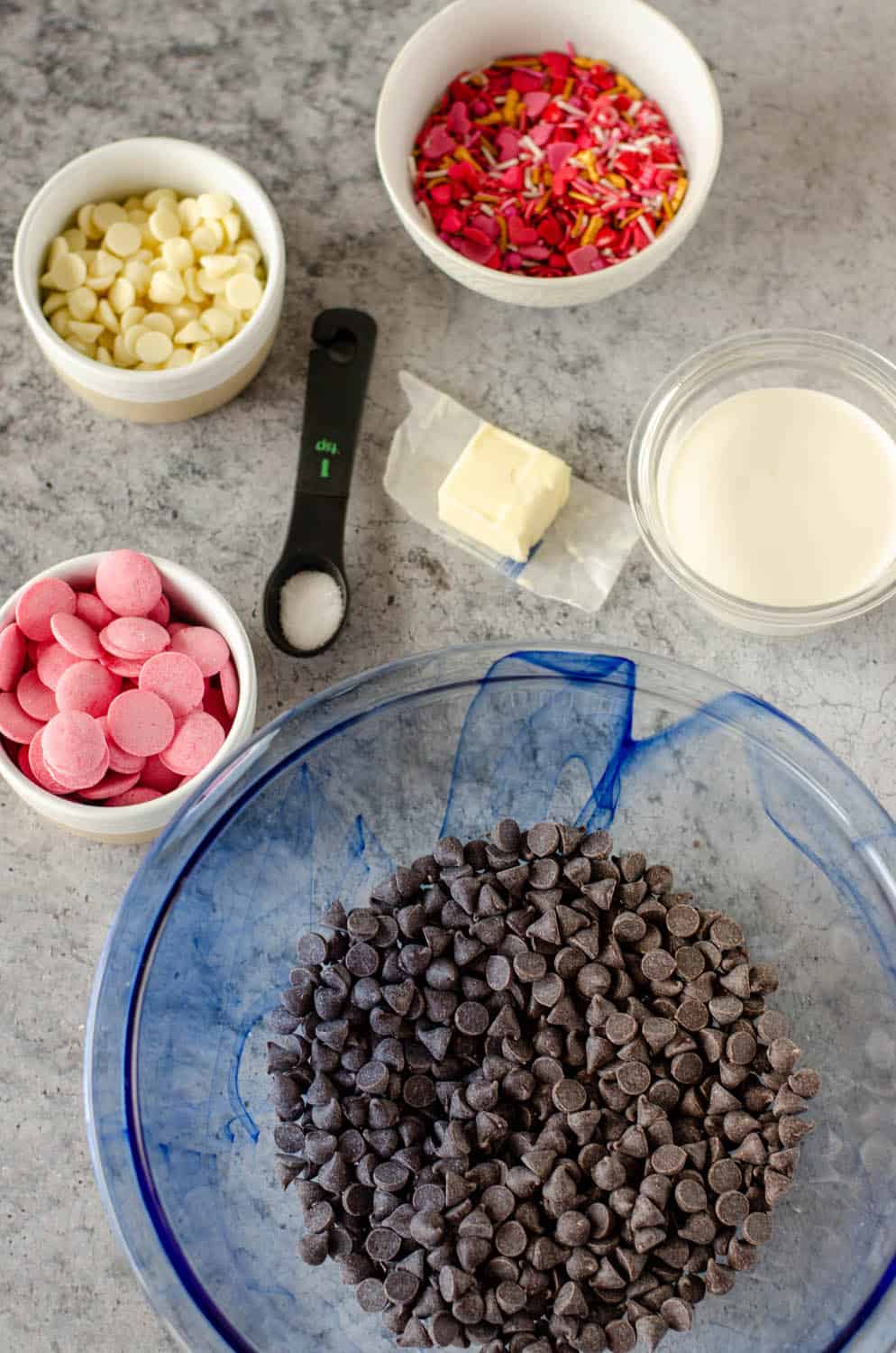 - Colored baking chips or melting wafers in Valentine’s Day colors