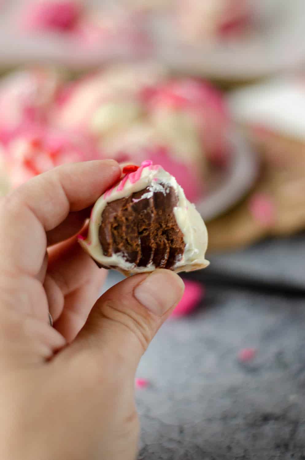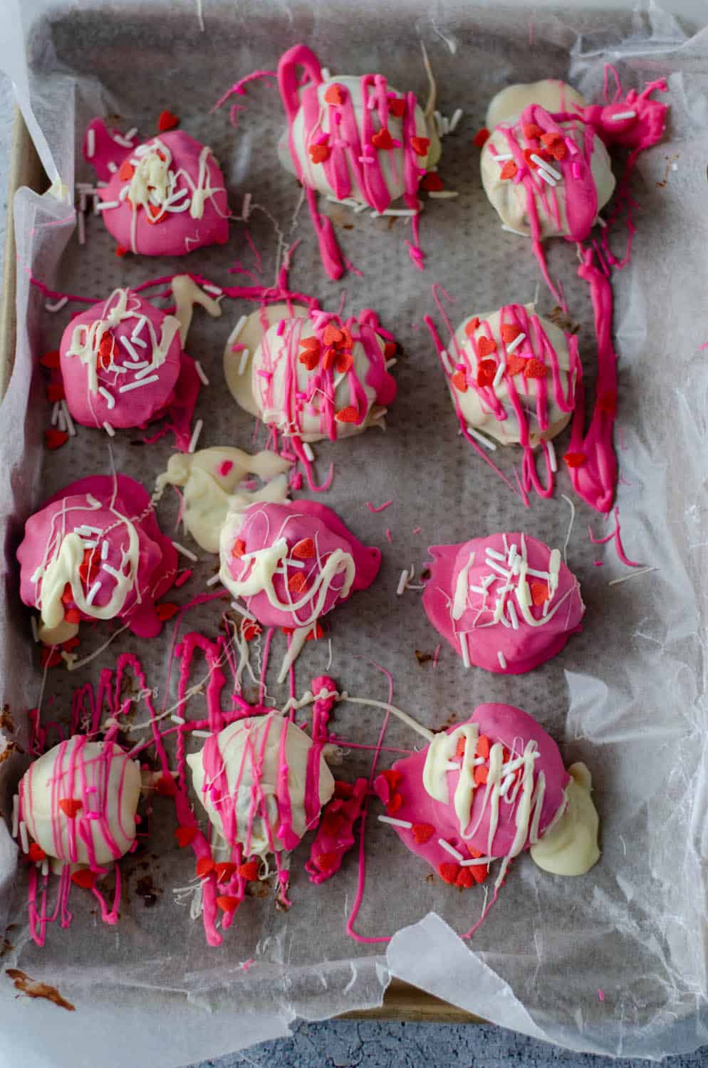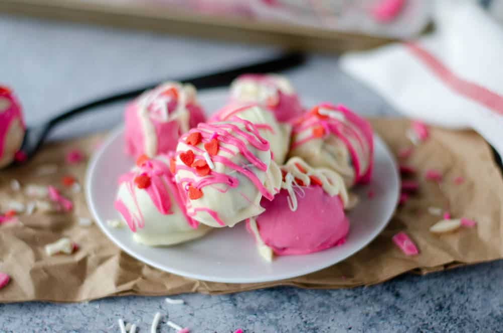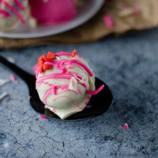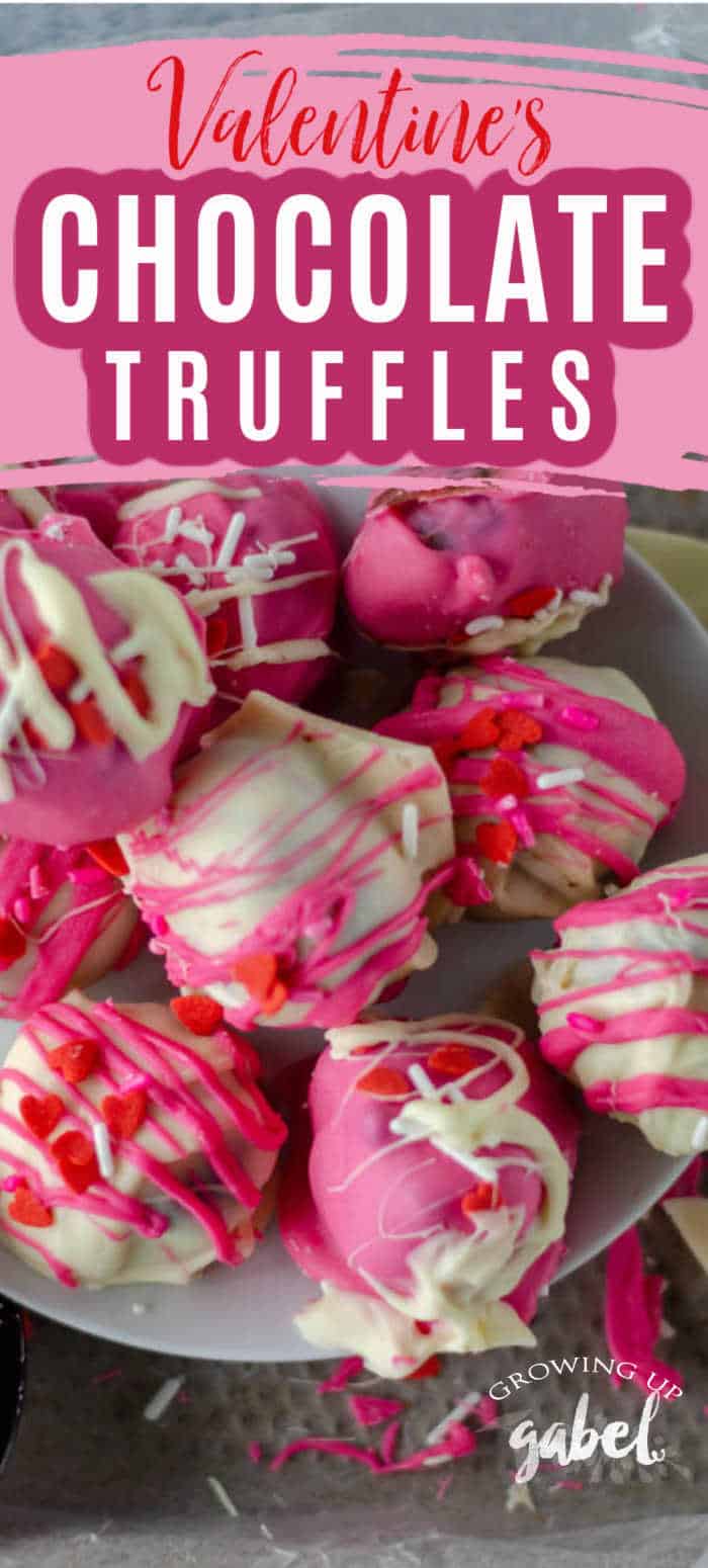 Valentine’s Day chocolate truffles are made with a chocolate ganache inside and then coated in red, white, and pink chocolate and sprinkles.