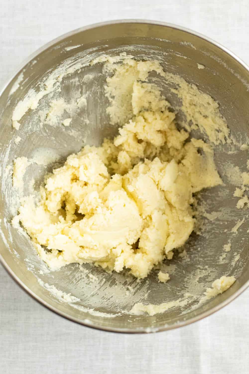 - Gradually add the milk and dry ingredients to the creamed butter and sugar until well incorporated. This is a fairly dry dough but if it is too crumbly add in more milk a teaspoon at a time until a dough forms.