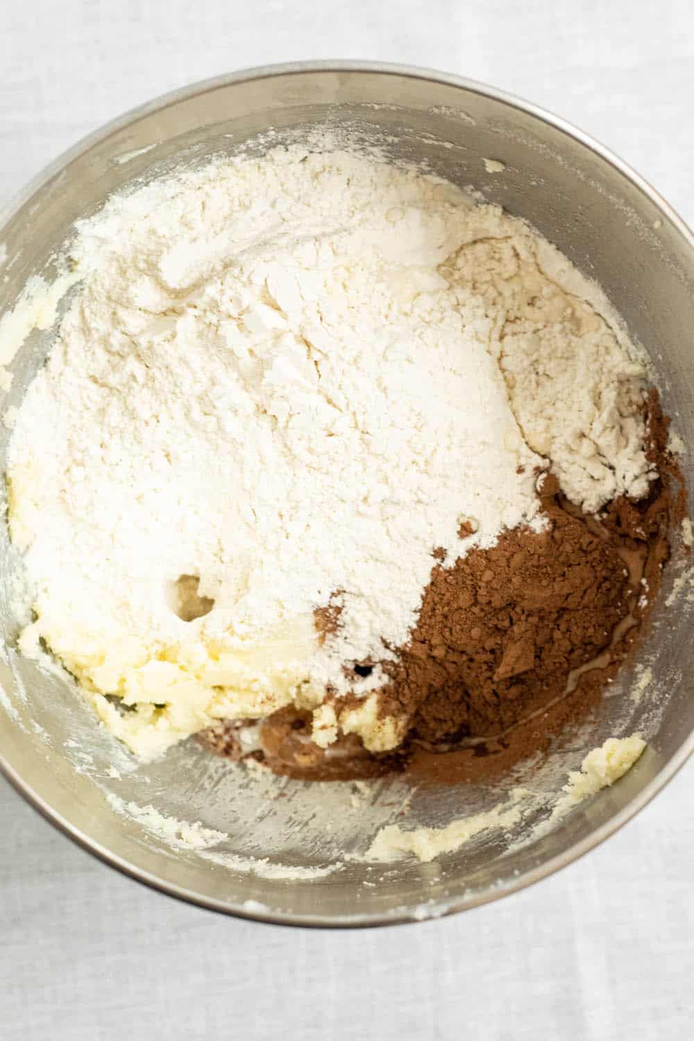 In a separate bowl combine flour, cocoa powder, baking powder, baking soda, and salt. Whisk together using a whisk or a fork to make sure it is well combined.
