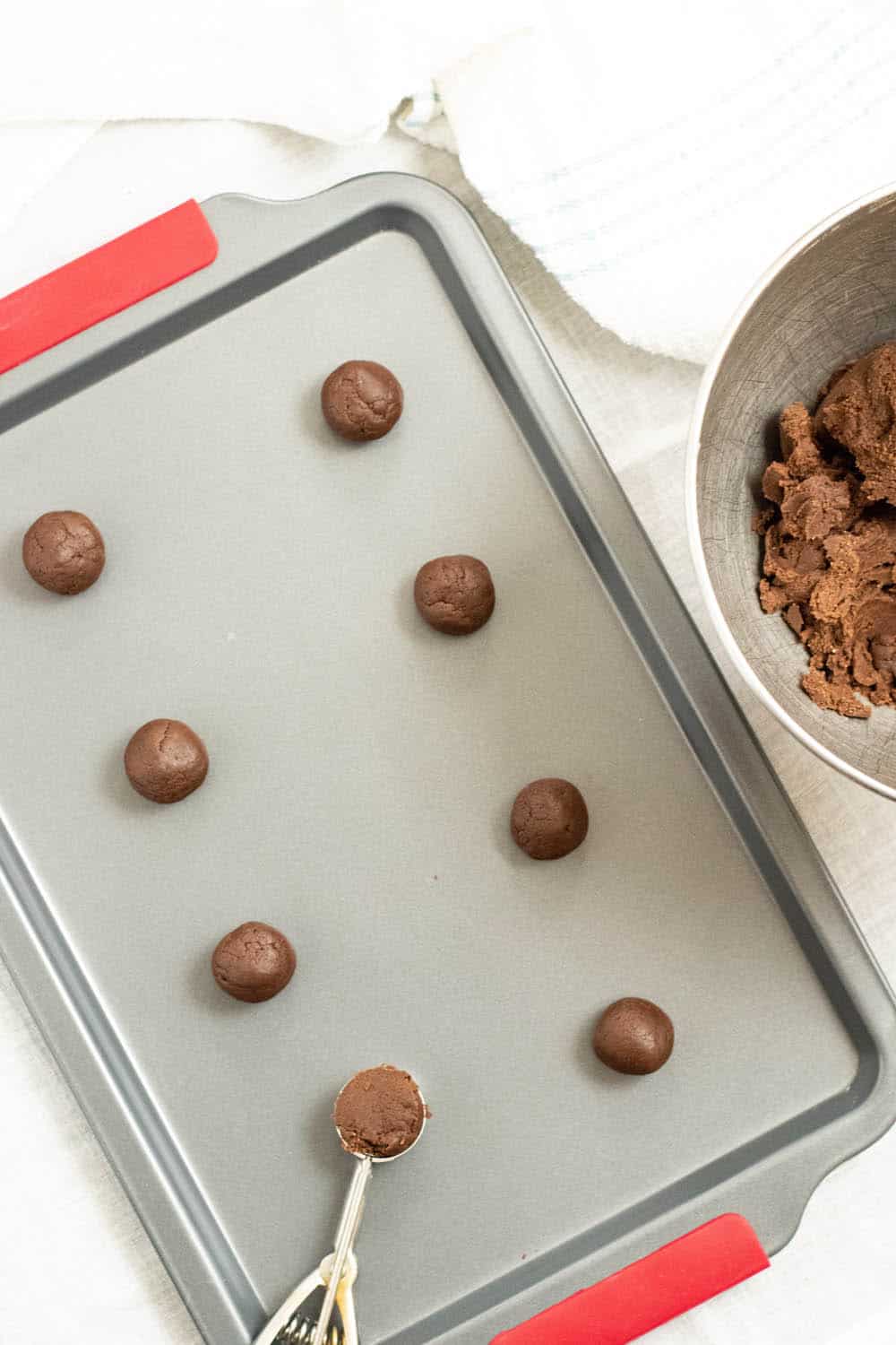 Using a dough scoop or spoon scoop out dough and roll it into balls about 1″ round. Place the balls about 2 inches apart on a cookie sheet. You can use parchment paper to make cleaning up easier.