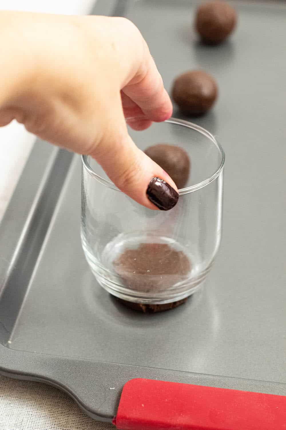 Use the bottom of a glass and flatten each cookie to about ¼ of an inch. If the glass is sticking to the dough, you can dip it in sugar. For cookies with smoother edges, you can flatten them between your hands and then place them on the cookie sheet.
