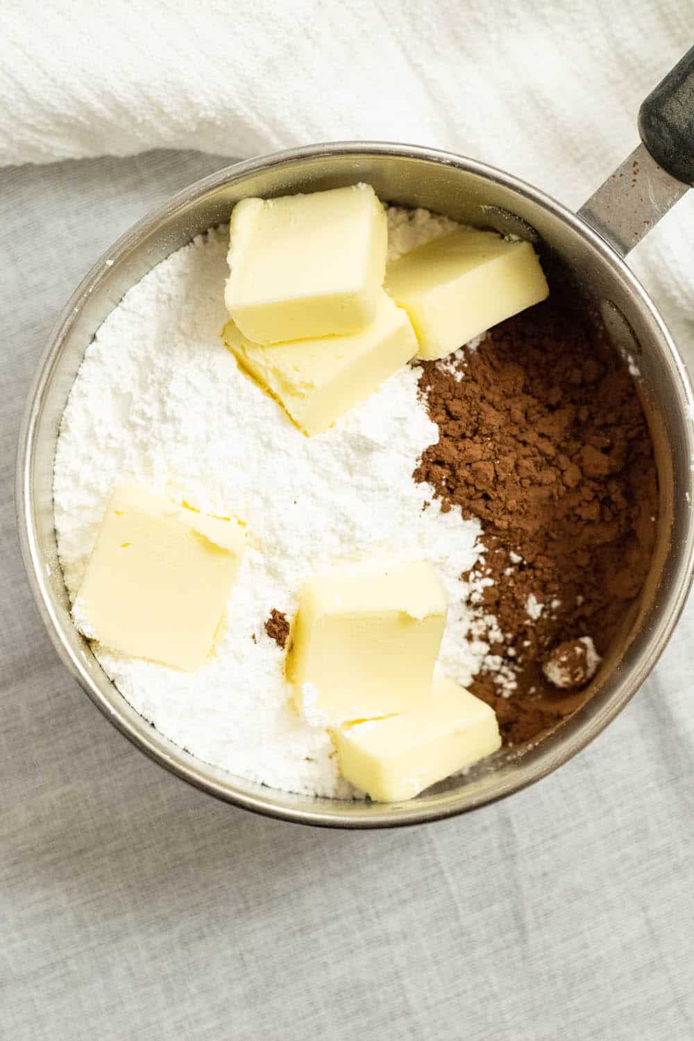 - To make the frosting, add the butter, cocoa powder, and milk to a saucepan and heat over medium heat.