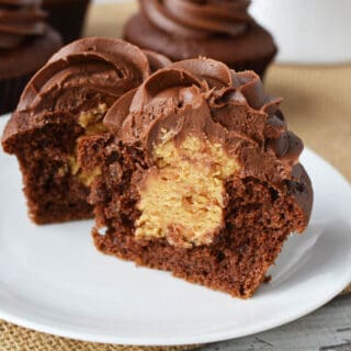 The classic combination of peanut butter and chocolate is amazing in these peanut butter filled chocolate cupcakes. Just use your favorite chocolate cupcake – either store bought or homemade. You’ll easily fill it with a thick fudge like peanut butter filling similar to the filling in Chocolate Peanut Butter Cookie Cups. Then top it all off with velvety chocolate frosting.