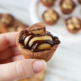 Drizzle ganache on cookie cups and top with a mini peanut butter cup. Let set for ganache to set and serve. You can store Chocolate Peanut Butter Cookie cups in an airtight container in the refrigerator.