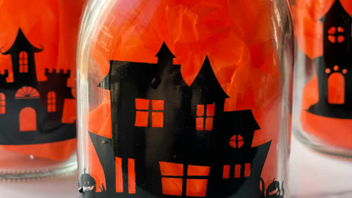 Make Halloween luminaries with mason jars and permanent vinyl using a haunted village SVG for Cricut cutting machines.