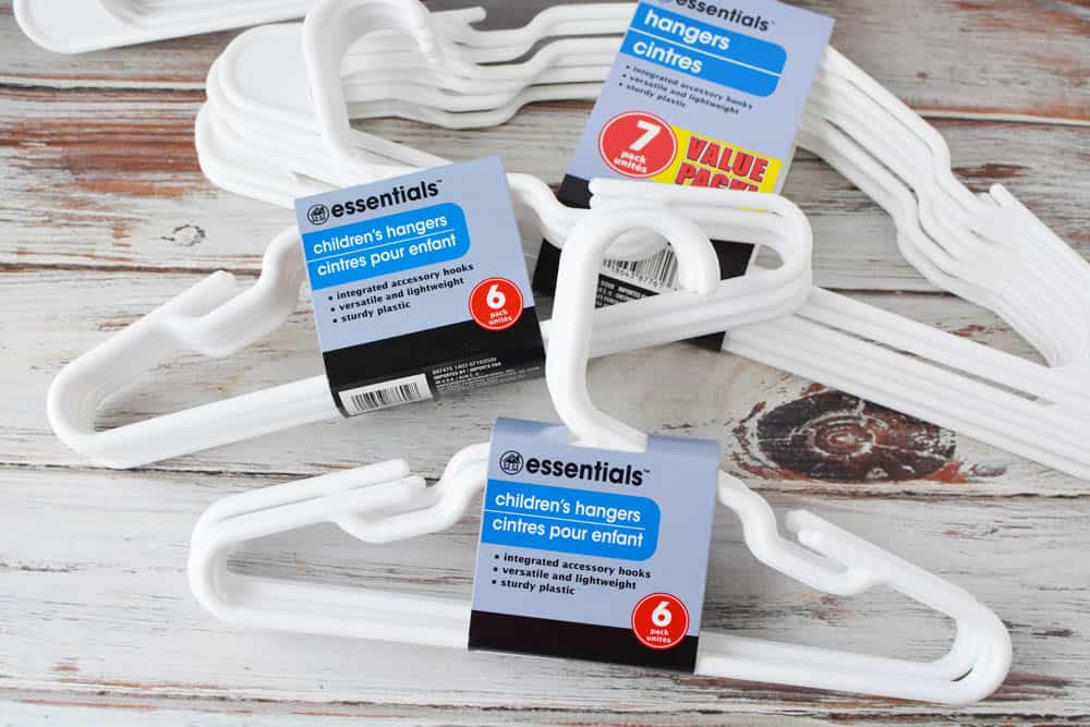 - 16 white plastic hangers with accessory hooks – you can also use kid or adult-size hangers