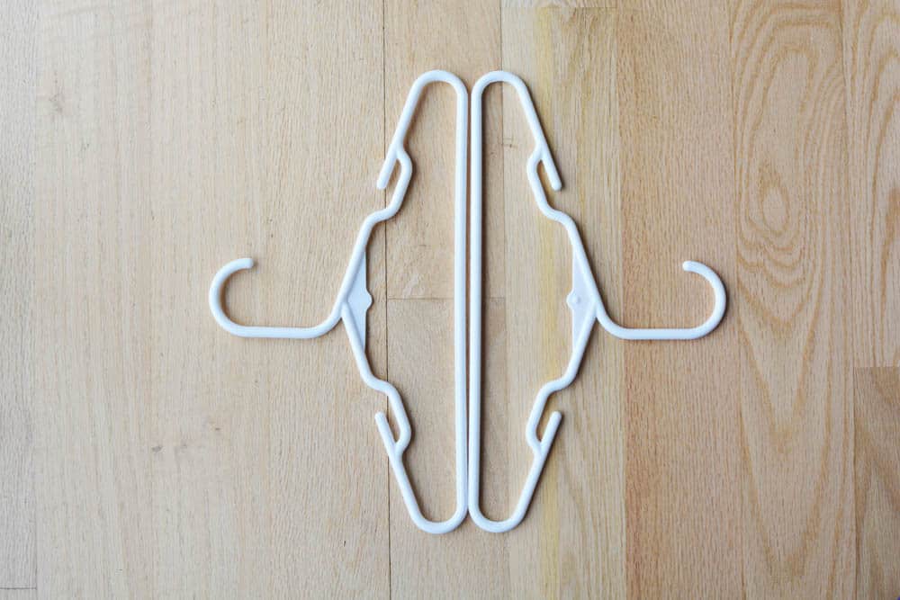 - Lay 2 hangers on a large flat surface with the flat bottoms touching each other.