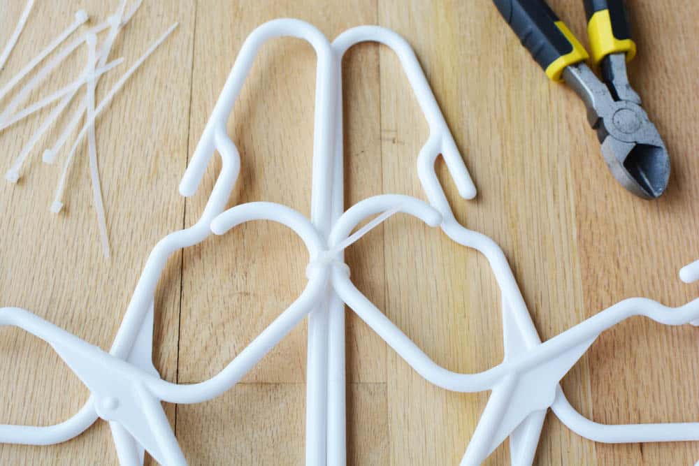 Loosely secure the intersections of the 2 hanger bottoms and the 2 hanger hooks with zip ties.
