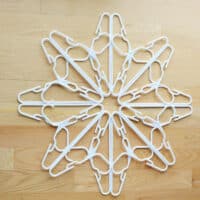 Make pretty lighted snowflakes using hangers and Christmas lights. This easy craft project simply requires creative tying together of white plastic hangers you can get at the dollar store. This tutorial will show you exactly how to lay the hangers down and attach them to create a pretty snowflake using adult or child-size hangers. The only difference is the size of the final snowflake. You can add Christmas lights to light up the snowflakes or simply leave them and use them as a wall decoration. The hanger snowflake lights can be hung inside or outside, even in winter.