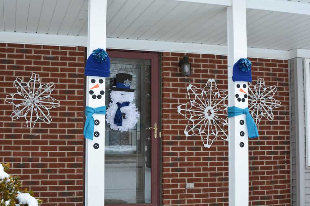 You can add to your porch decorations with porch pillar snowmen (which can also be made using wood boards) and a snowman rag wreath.