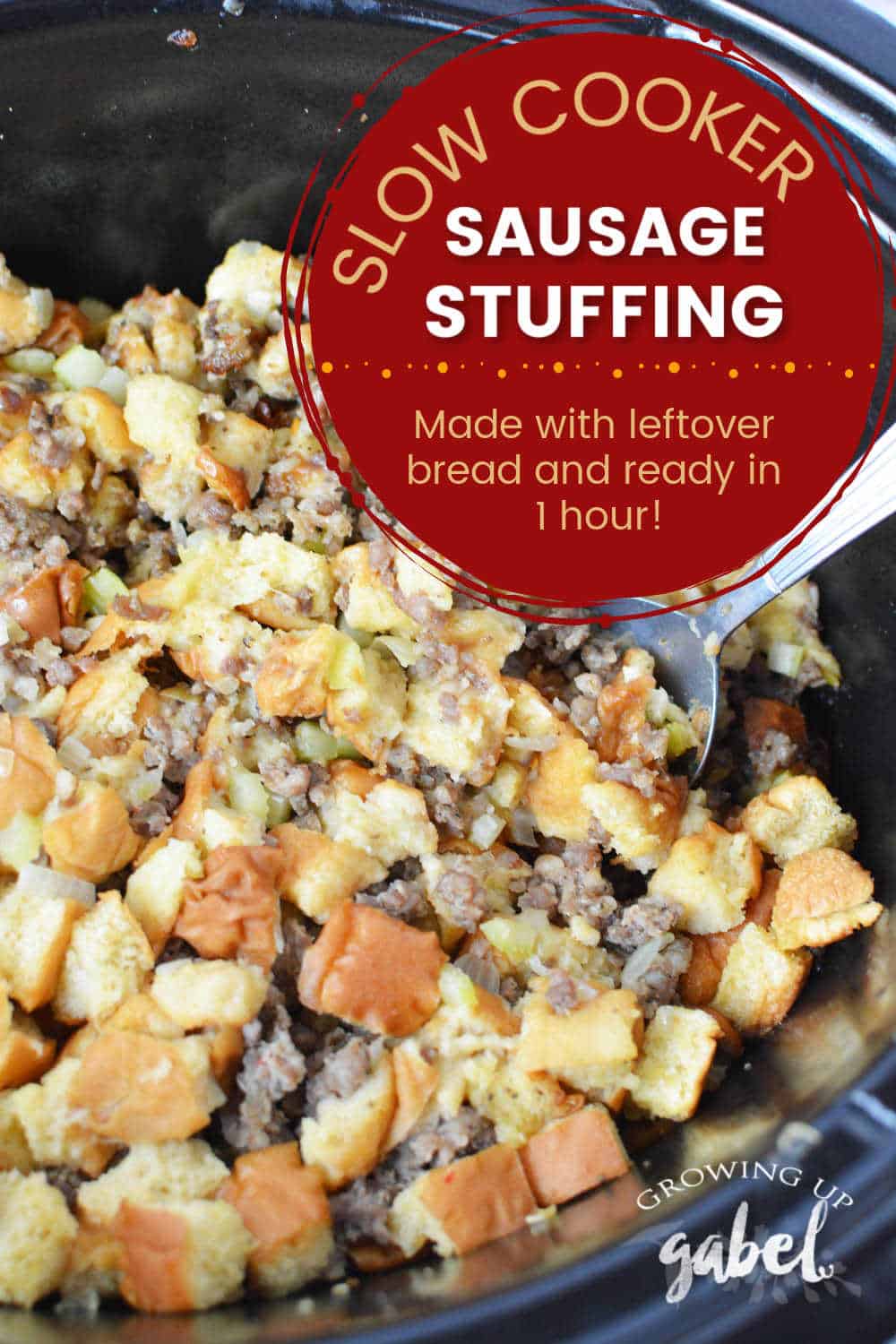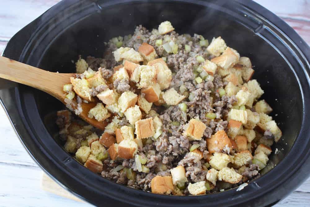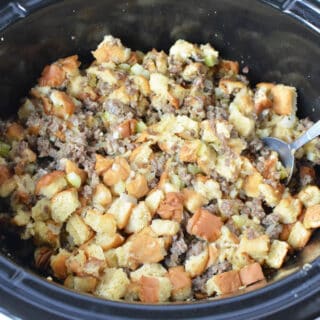 Slow cooker stuffing is easy to make using sausage and leftover bread plus it’s ready in an hour!