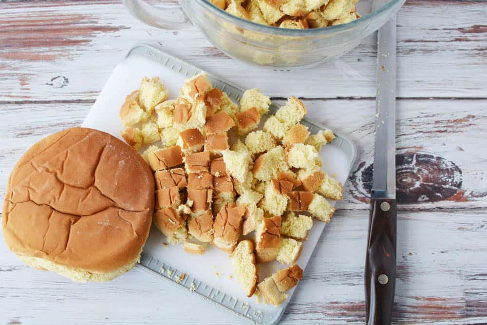 - Cubed bread – Save up old bits and pieces of bread, bagels, buns, etc, and use them all.