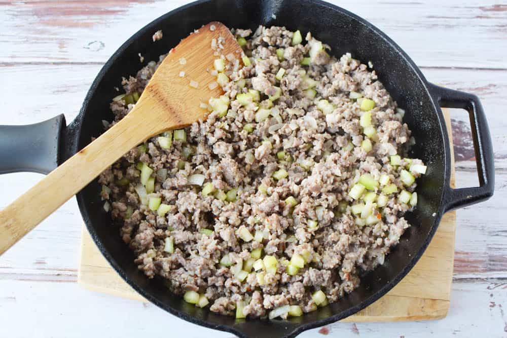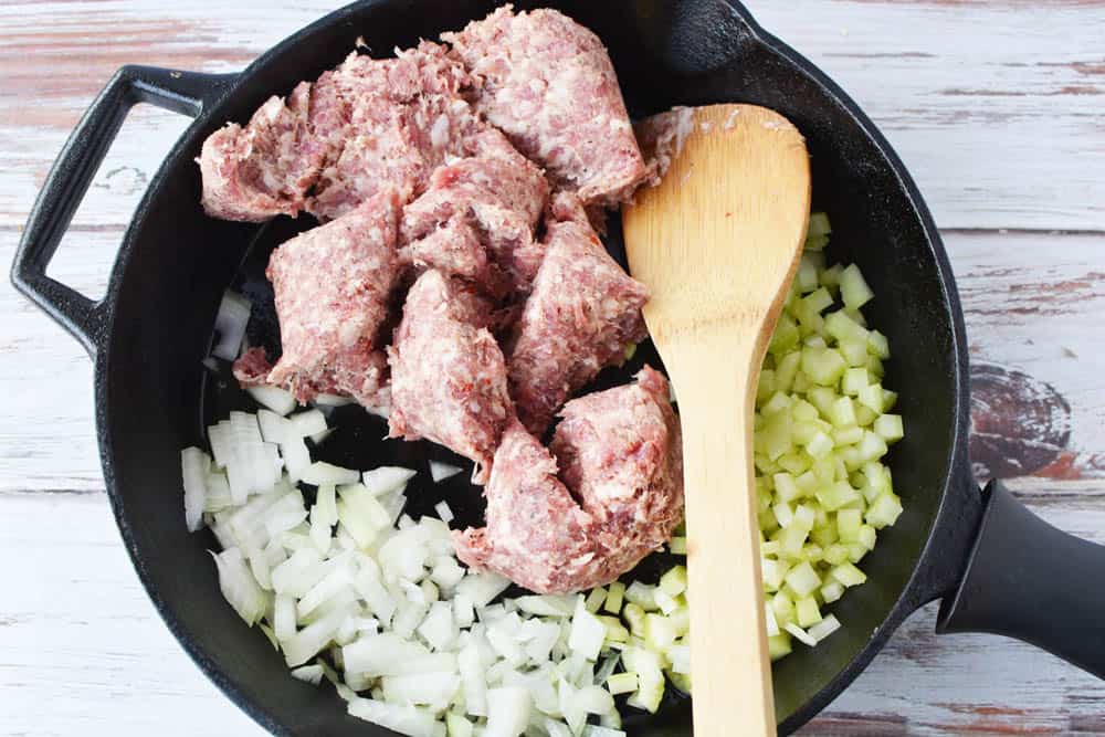 Heat a skillet on the stove over medium-high heat. Once it is hot, add the sausage, celery and onion to a skillet. Stir frequently and break apart the sausage as it cooks. You want it to be finely chopped.