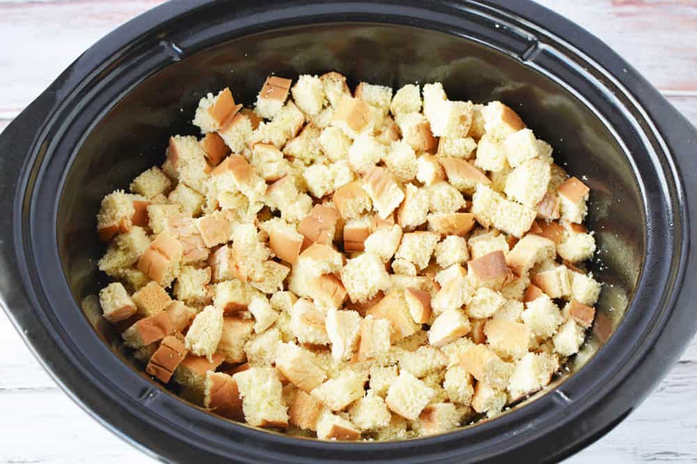 - Grease a slow cooker with nonstick cooking spray and add bread to a slow cooker. Set aside.