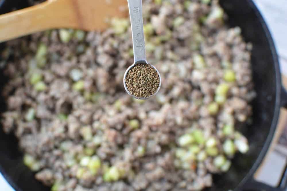 Remove from heat and stir in celery seed and any other herbs or spices you are using. Celery seed adds a great flavor to this stuffing. If you don’t have celery seed, you will definitely want to add some more herbs. Rosemary, thyme, or a poultry seasoning work well. Add salt and pepper to taste.