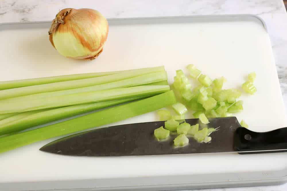Dice the celery and onions and put in the slow cooker. Make sure to use a slow cooker that is the right size. You want the slow cooker to be 2/3 full – no more and no less. This recipe will need a smaller size slow cooker, about 3-4 quarts. Double it and use a 6-quart slow cooker.