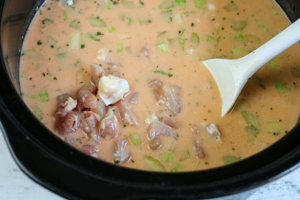 Next, cut the chicken into 1/2″ cubes and place in the slow cooker. You can use either thighs or breasts, but thighs tend to cook better in a slow cooker. Add the coconut milk, buffalo sauce, ranch dressing mix to the slow cooker, and mix it all together.