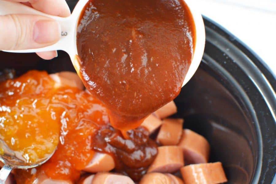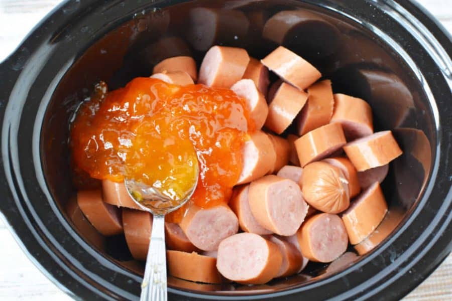 Add apricot preserves to the slow cooker.We used apricot preserves but you can probably switch that up. The taste will be a little different but it’d be fun to play with different jams and jellies.