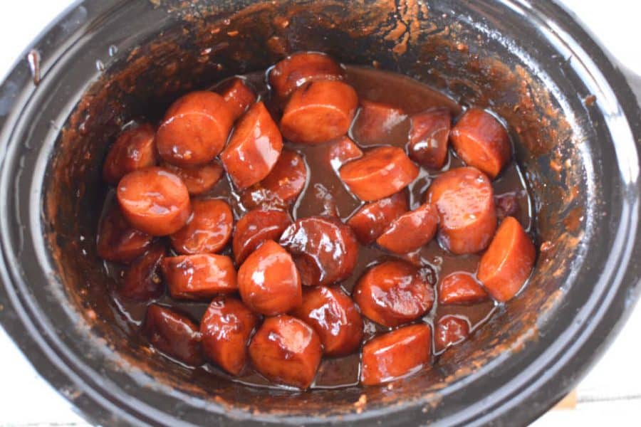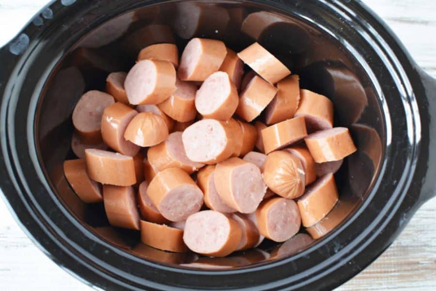 We used large smoked sausages to make this appetizer because someone thought smoked sausage was a little smokie. If this happens to you, just cut the sausages into 1″ slices and place into a slow cooker.