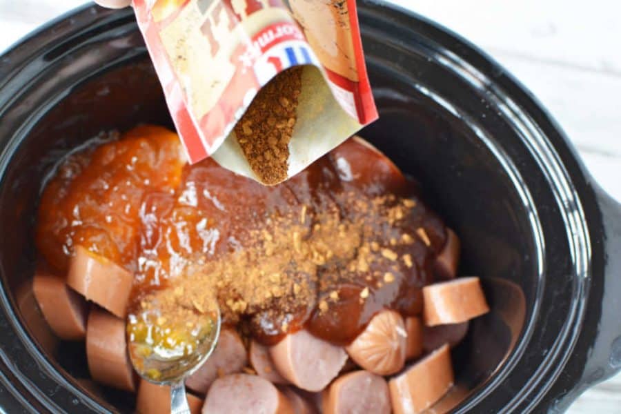 Mix it well altogether so the sausages are coated well. You can also mix these together in a small bowl and then just add to the crock pot.