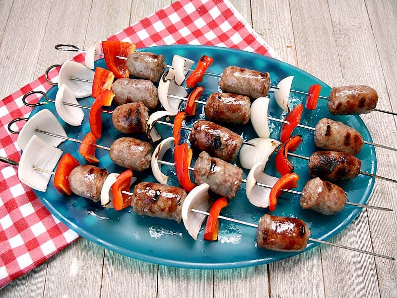 We took the brats out of the bun and made them into kebabs. Johnsonville Brats are gluten free and serving them as kebabs is a fun option for your gluten free guests.