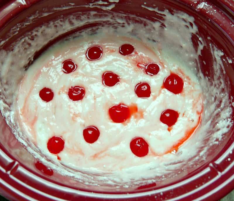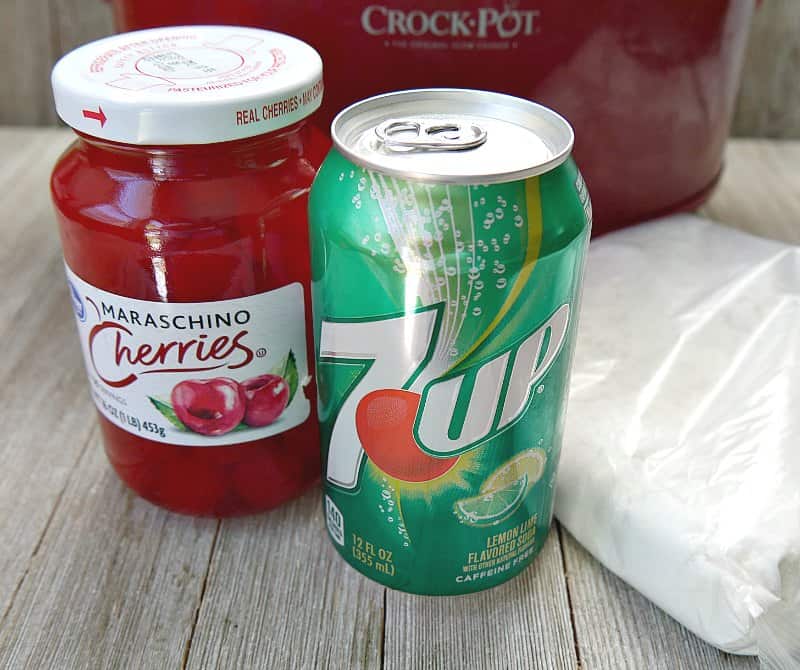 The three ingredients you need for this slow cooker cake are 7UP, a white box cake mix, and maraschino cherries. The cherries add a nice color and flavor to the cake, but you can make this without them, too.