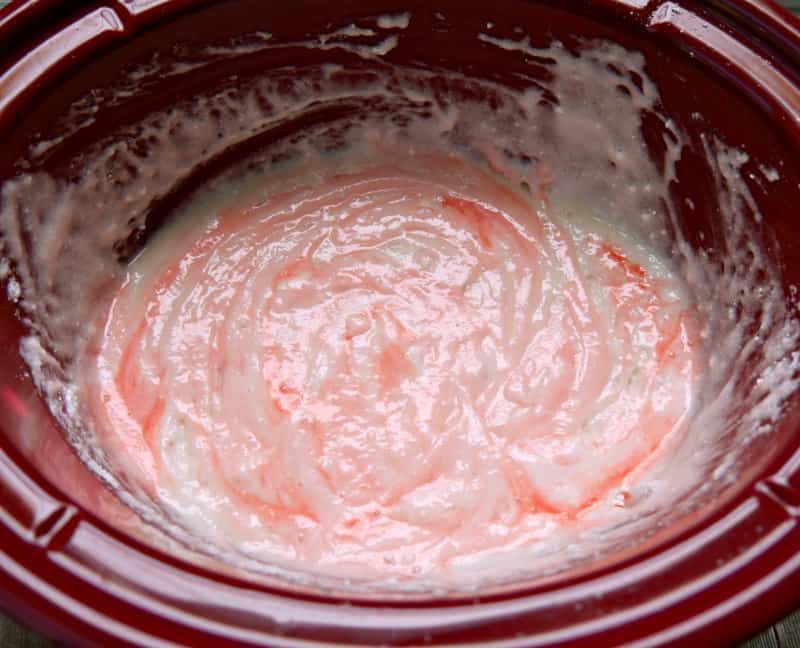 Open the cake mix and dump it in to the bottom of the crock of a 4 quart slow cooker. We used white cake mix but a Funfetti or even a cherry box cake mix would be fun to try.